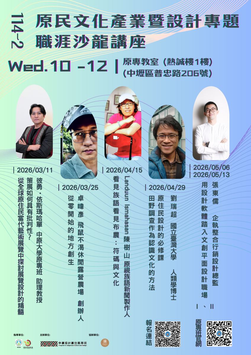 (四)第四場:115年4月29日(星期三)10時至12時,講座主題:原住民設計的必修課:田野調查作為認識文化的方 法。